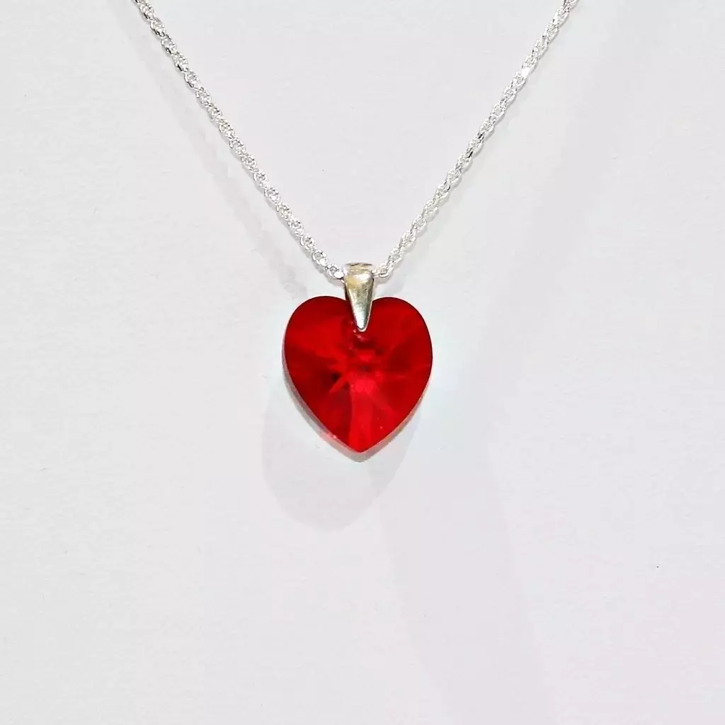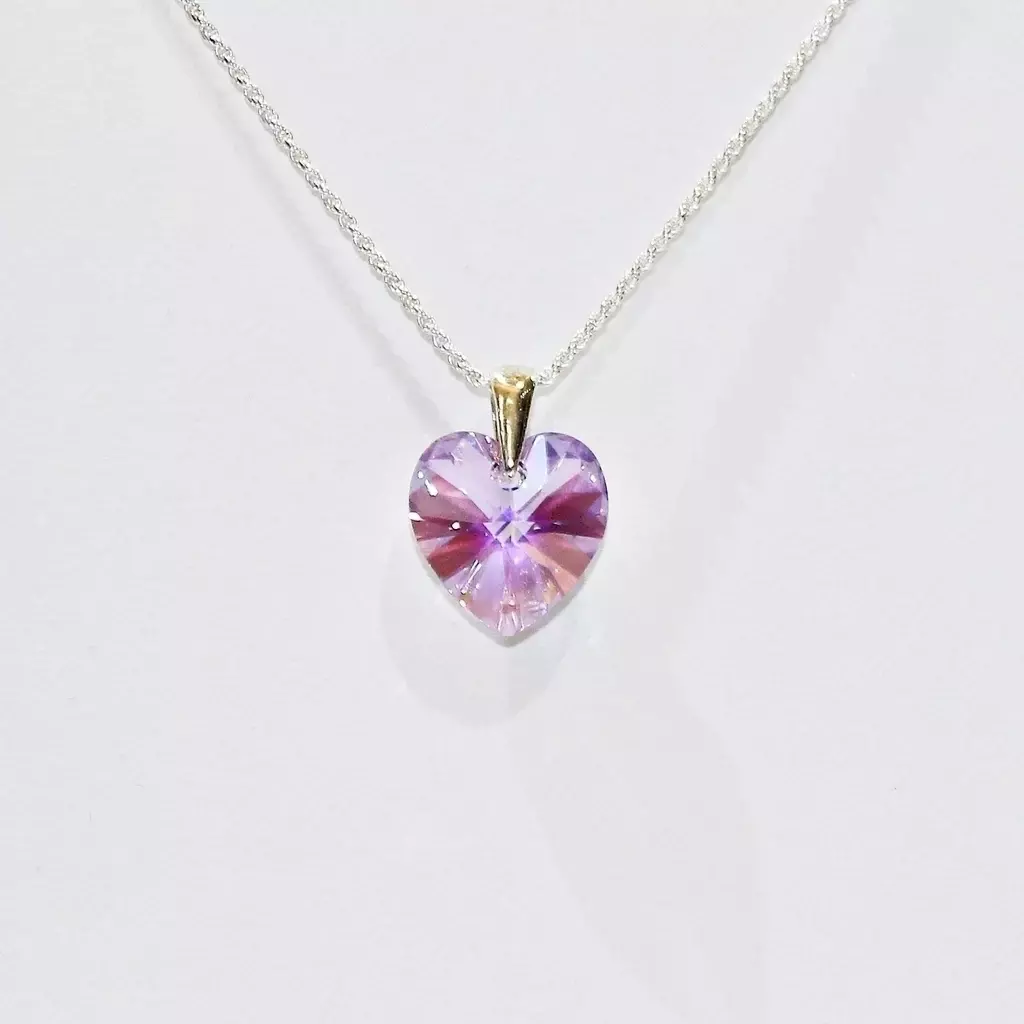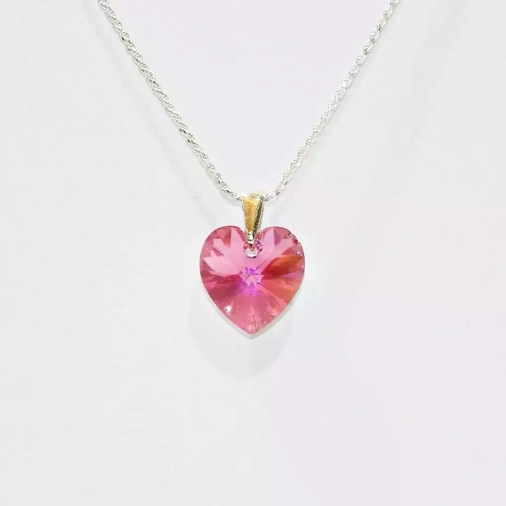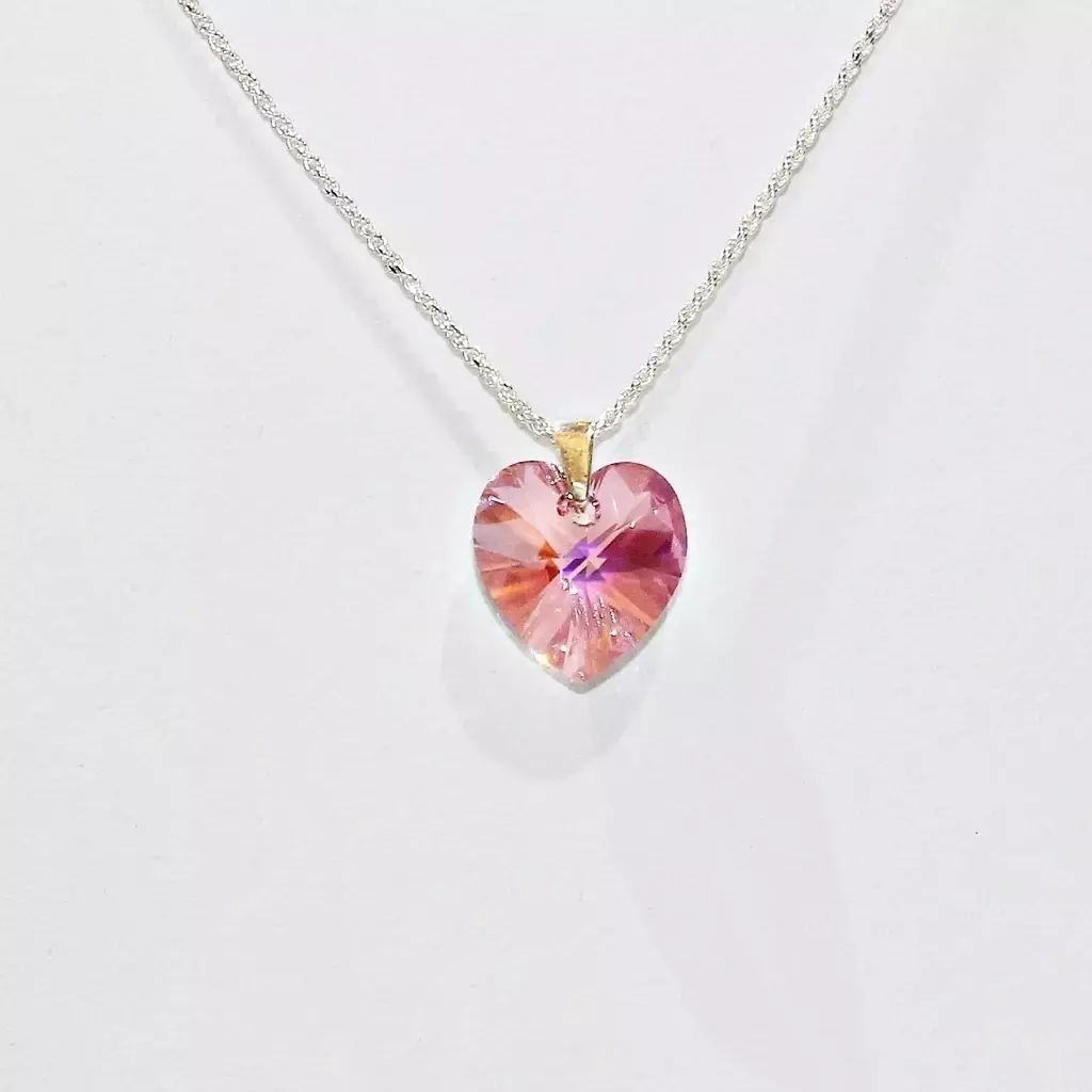 Descubre el famoso dije en forma de corazón de 14mm, elaborado con cristal SW de excepcional calidad. Este delicado dije, engarzado en plata, es una joya que destaca por su brillo y elegancia.
